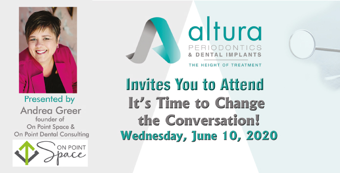 It’s Time to Change the Conversation! Andrea will teach several key conversations that can be changed to meet the challenge of increasing perceived value for dentistry and for your practice. This course will be a game-changer for you, your team and your patient family!
